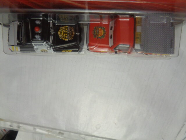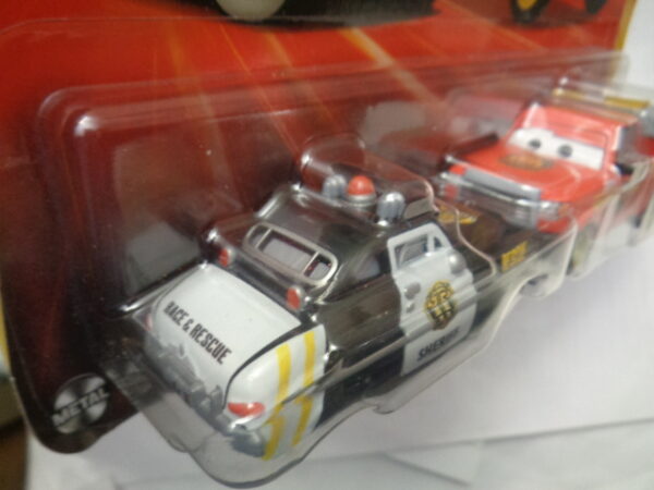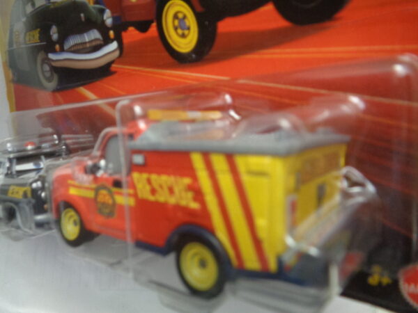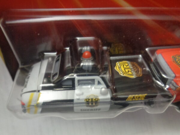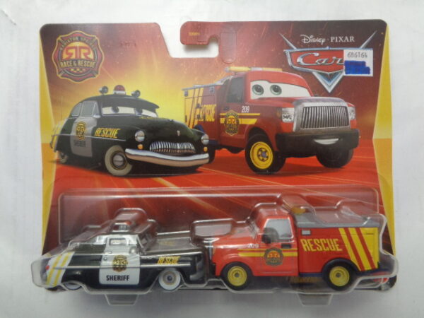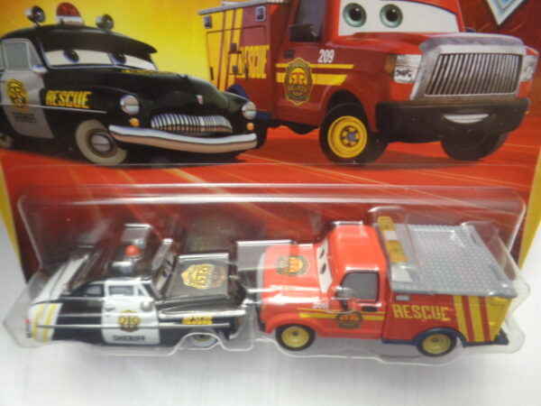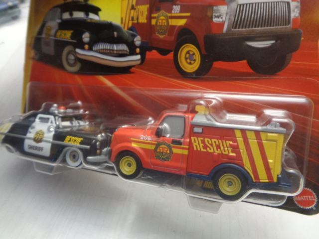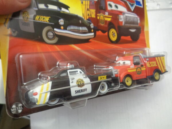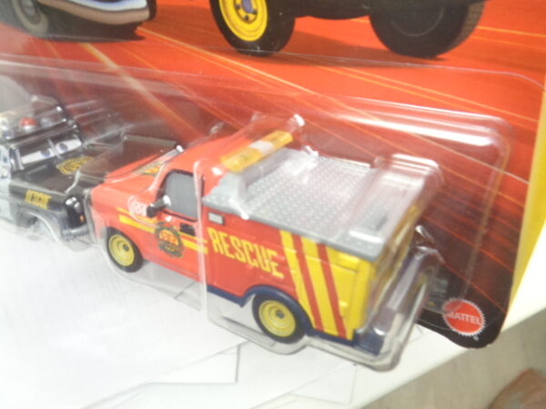 / Mattel – 2024 – Disney Pixar Cars – Duo – Radiator Springs – Race & Rescue – SHERIFF – ADAM RODRIGUEZ – Police car in black and rescue truck in red